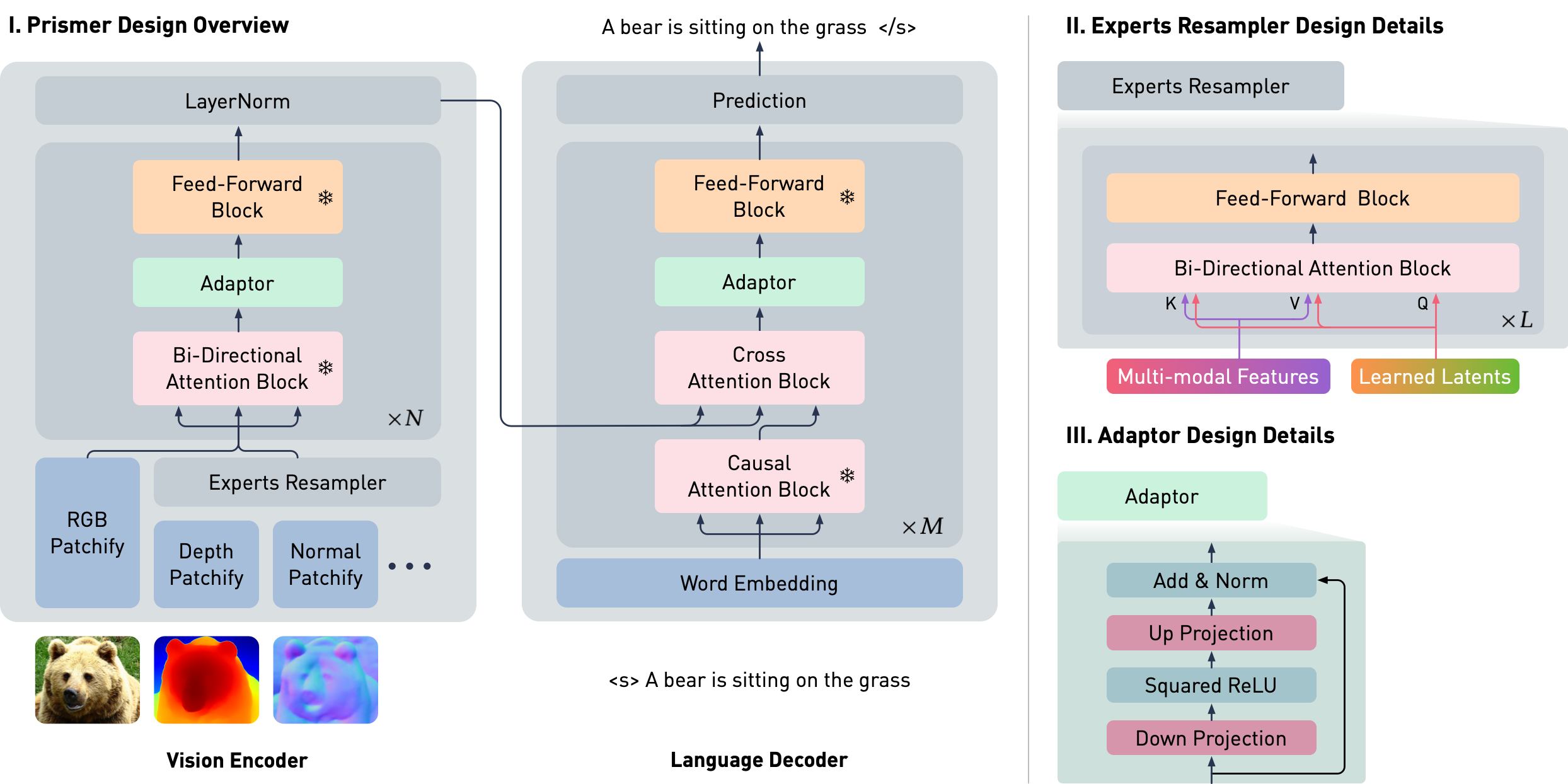 Prismer has two main trainable components: the Experts Resampler that converts variable multi-task signals to a fixed number of outputs, and the Adaptor that enhances the model's expressivity for vision-language reasoning. To ensure that the model takes advantage of the rich domain-specific knowledge encoded in the pre-trained experts, the majority of network weights are frozen during training, as represented by the snowflake icon.
