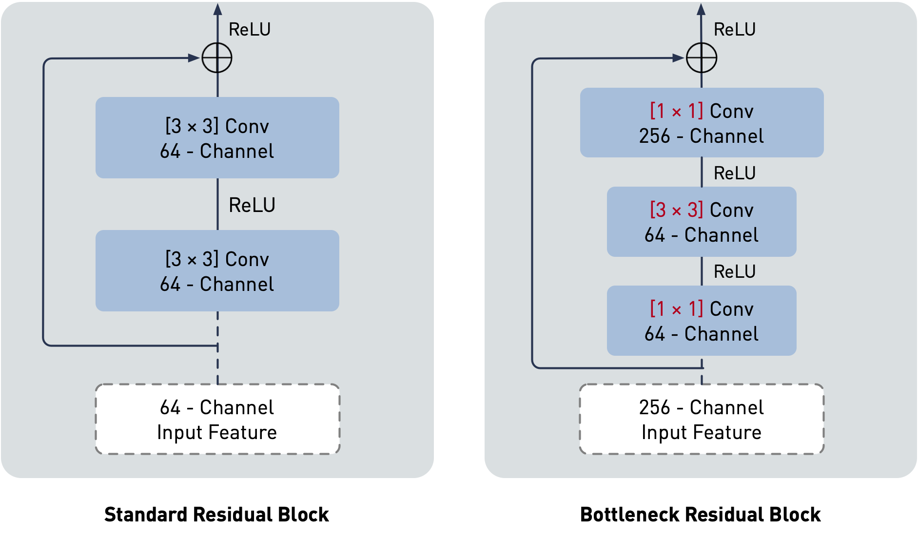 Here is an example I redesigned, illustrating the difference between standard and bottleneck residual blocks as proposed in Residual Networks.